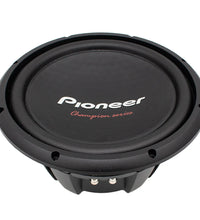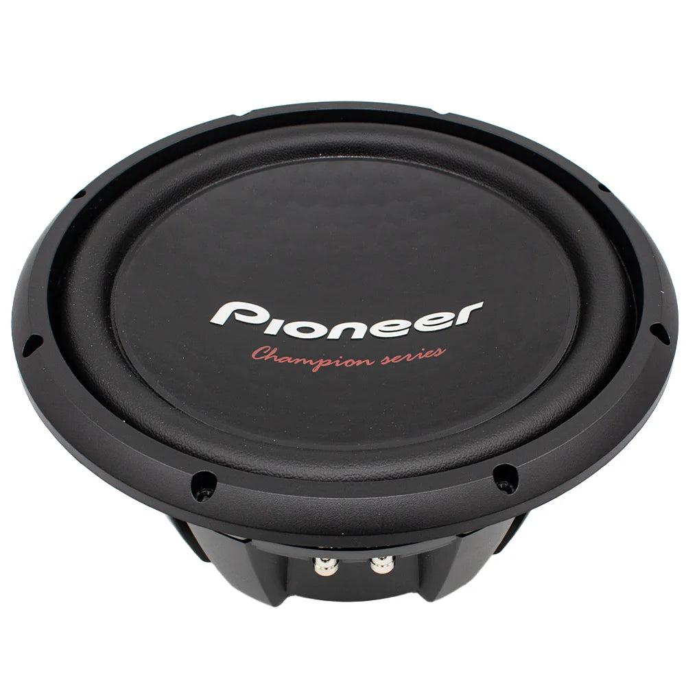 The Pioneer TS-W312D4 is a 12” Champion Series subwoofer with 1600W max power and 500W RMS, featuring dual 4Ω voice coils for flexible wiring and deep, high-impact bass.
